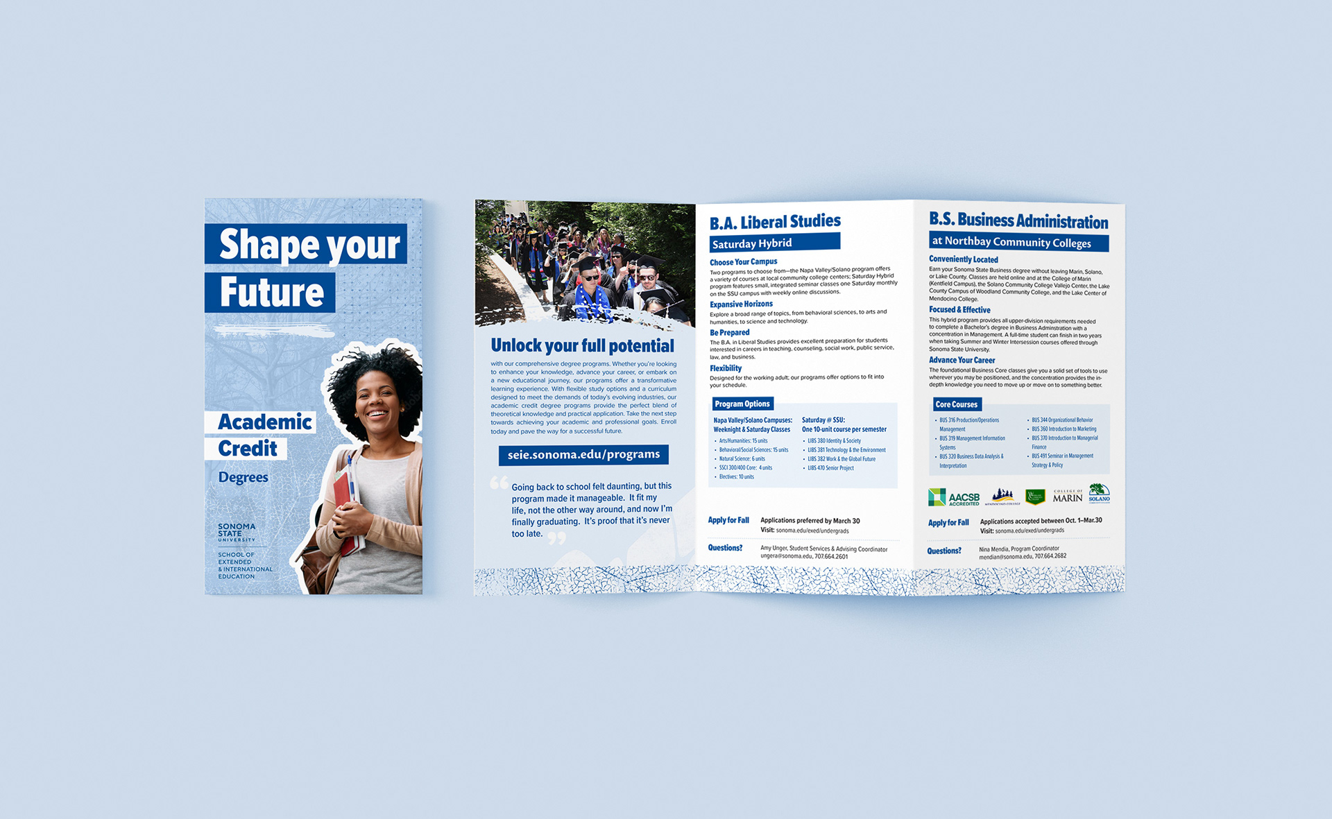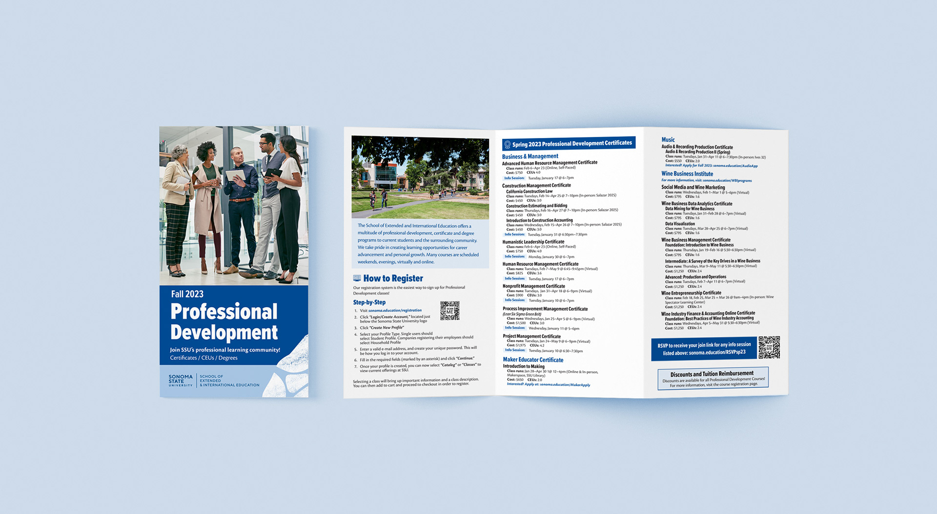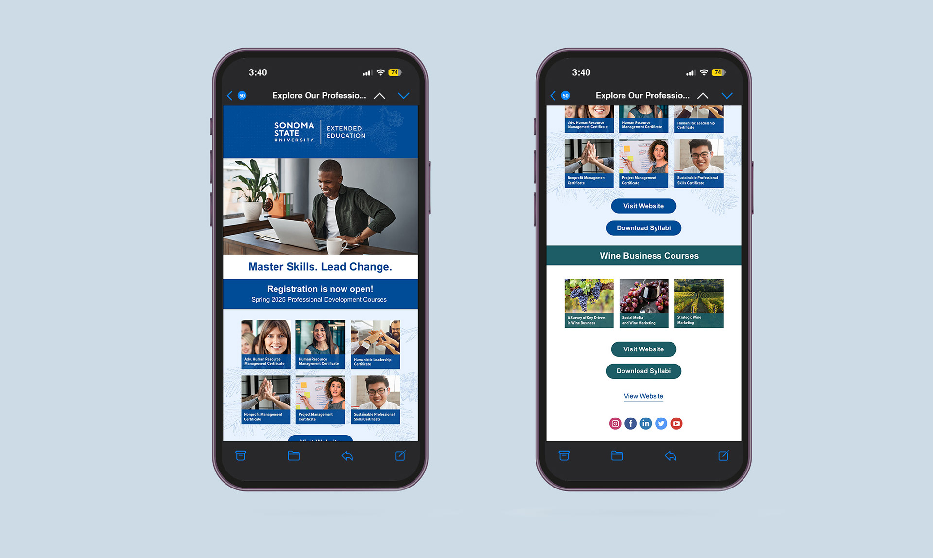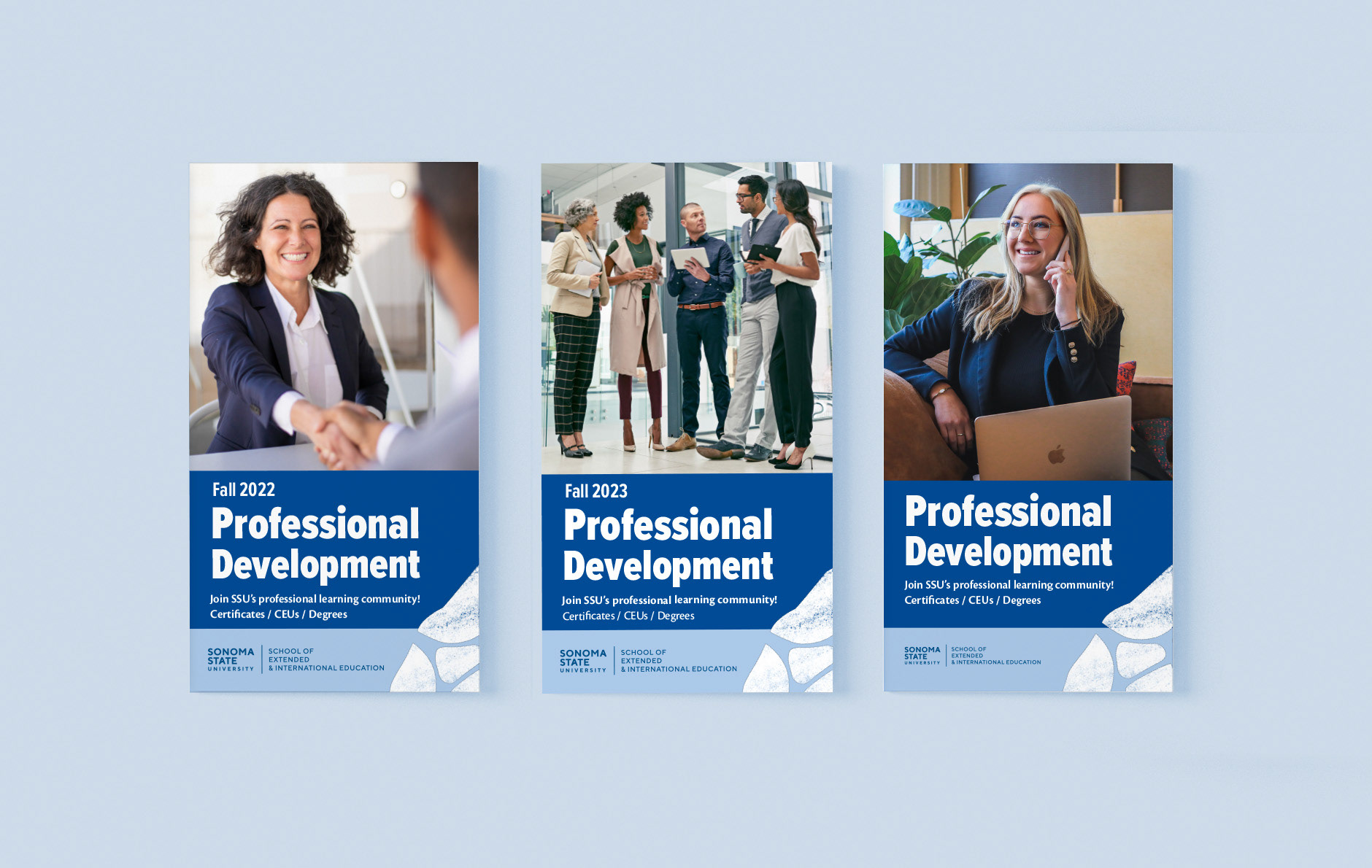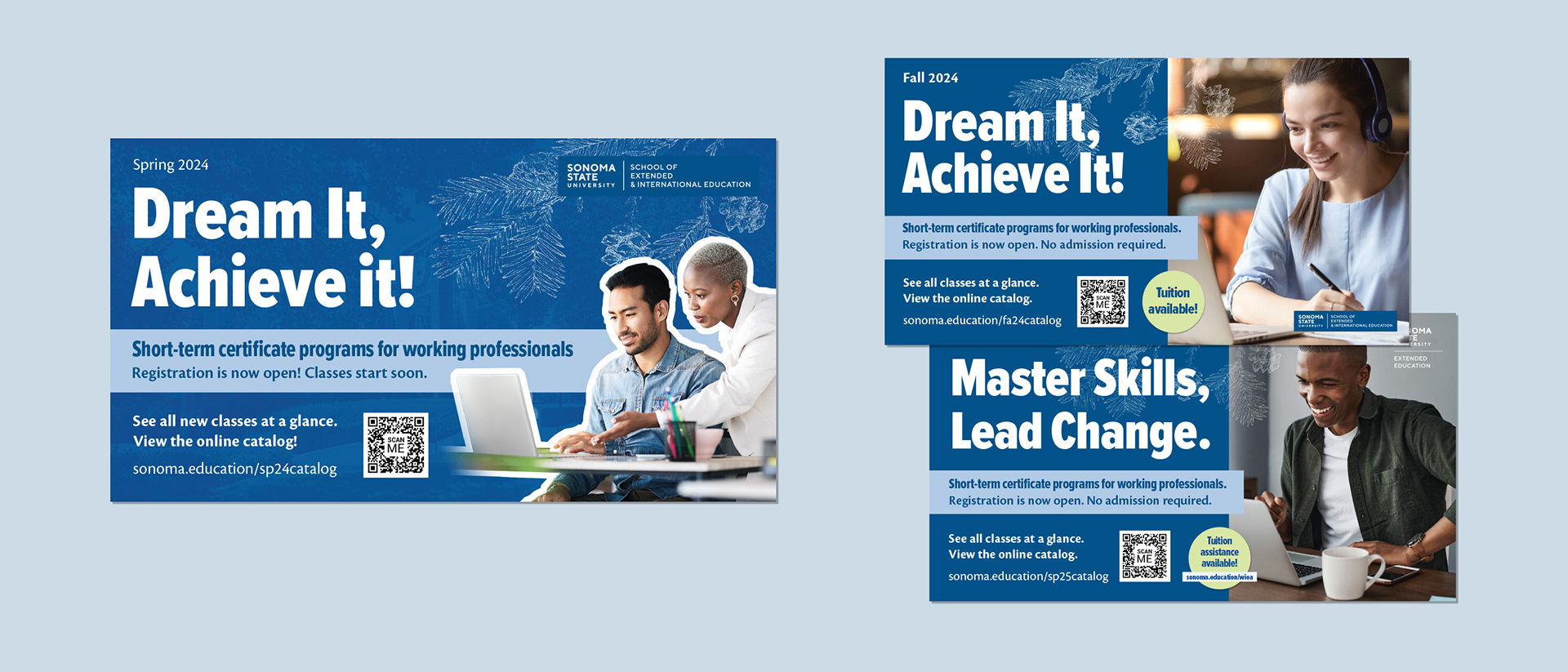 I focused on developing a complete set of marketing materials for a range of professional development, and Academic Credit programs. Working within the university's established brand guidelines, I carefully applied their approved color palettes, textures, and fonts to create a unified visual identity across all platforms. I designed brochures, fliers, program catalogs, social media graphics, emails, and digital ads. My goal was to create materials that not only looked cohesive and professional but would also effectively drive enrollment and significantly enhance the programs visibility.