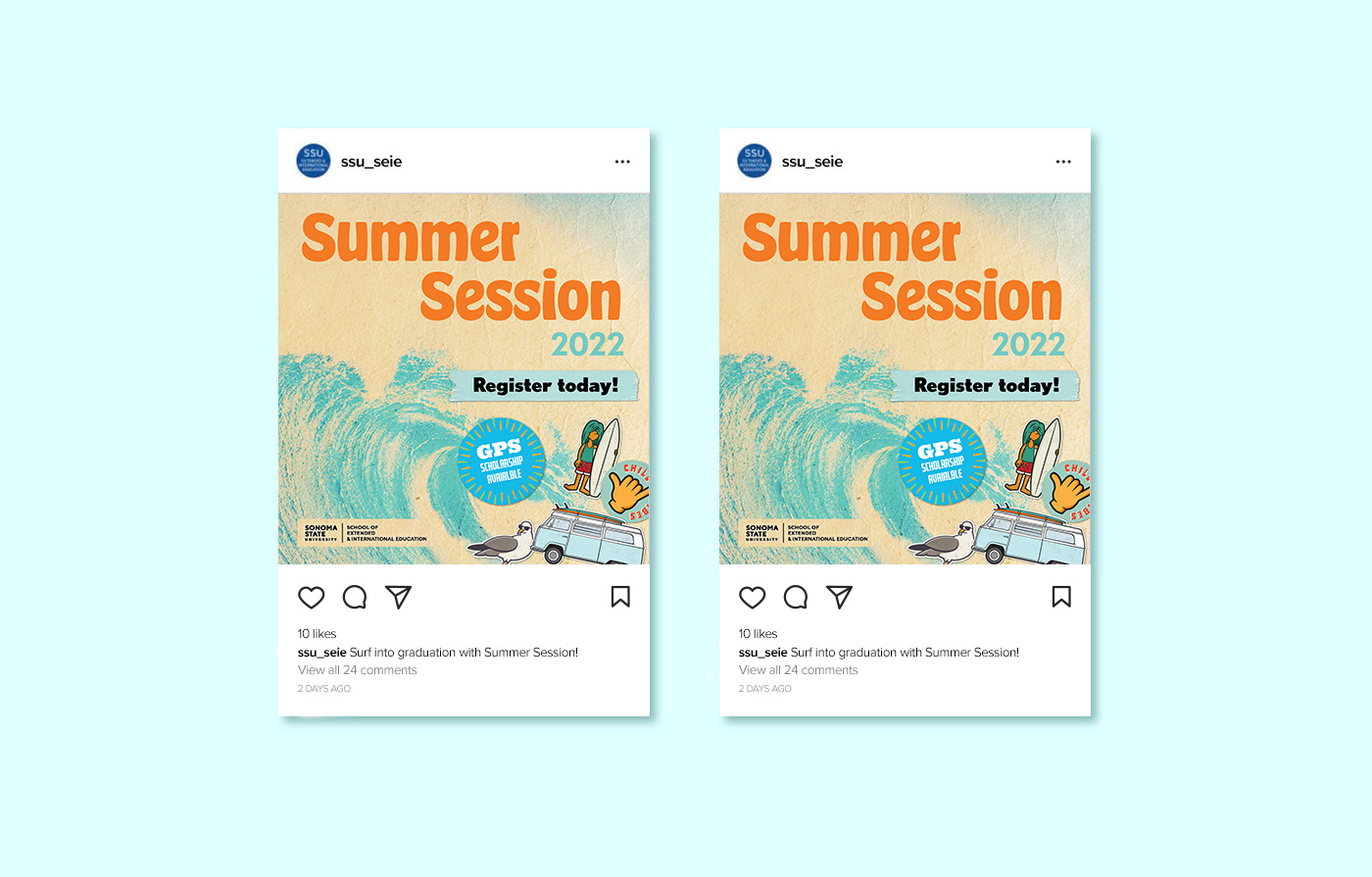 For Summer 2023, I designed and developed a visual identity with a retro surf vibe, aiming for a nostalgic aesthetic. This was achieved using a minimal color palette centered on oranges and blues, and applying photographic filters to create a weathered look. To inject a playful and fun element, I incorporated sticker-like graphics throughout the campaign. These graphics, featuring whimsical surf-related icons and hand-drawn lettering, added a lighthearted touch that resonated with the target audience.